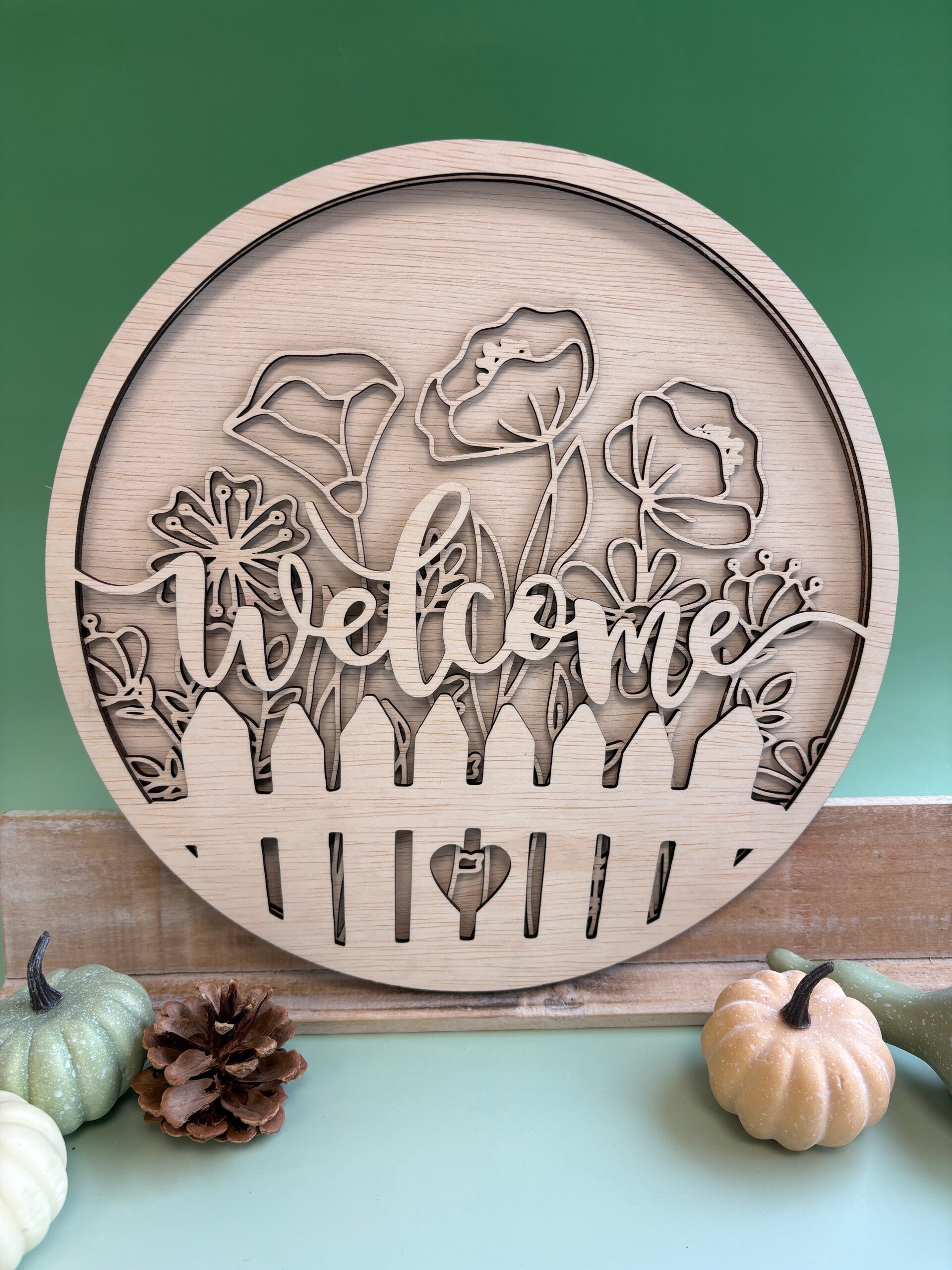 Decoratief houten bord met bloemen, een hek en het woord Welcome. Het bord bestaat uit drie lagen, elk gesneden uit 3mm multiplex, en de doorsnede is 22cm. Je kunt er voor kiezen het bord onbehandeld te laten voor een natuurlijke uitstraling, of de tussenlaag met de bloemen van kleur te laten voorzien. De onder- en bovenlaag blijven daarbij naturel, zodat het geheel zijn rustige en warme look behoudt.