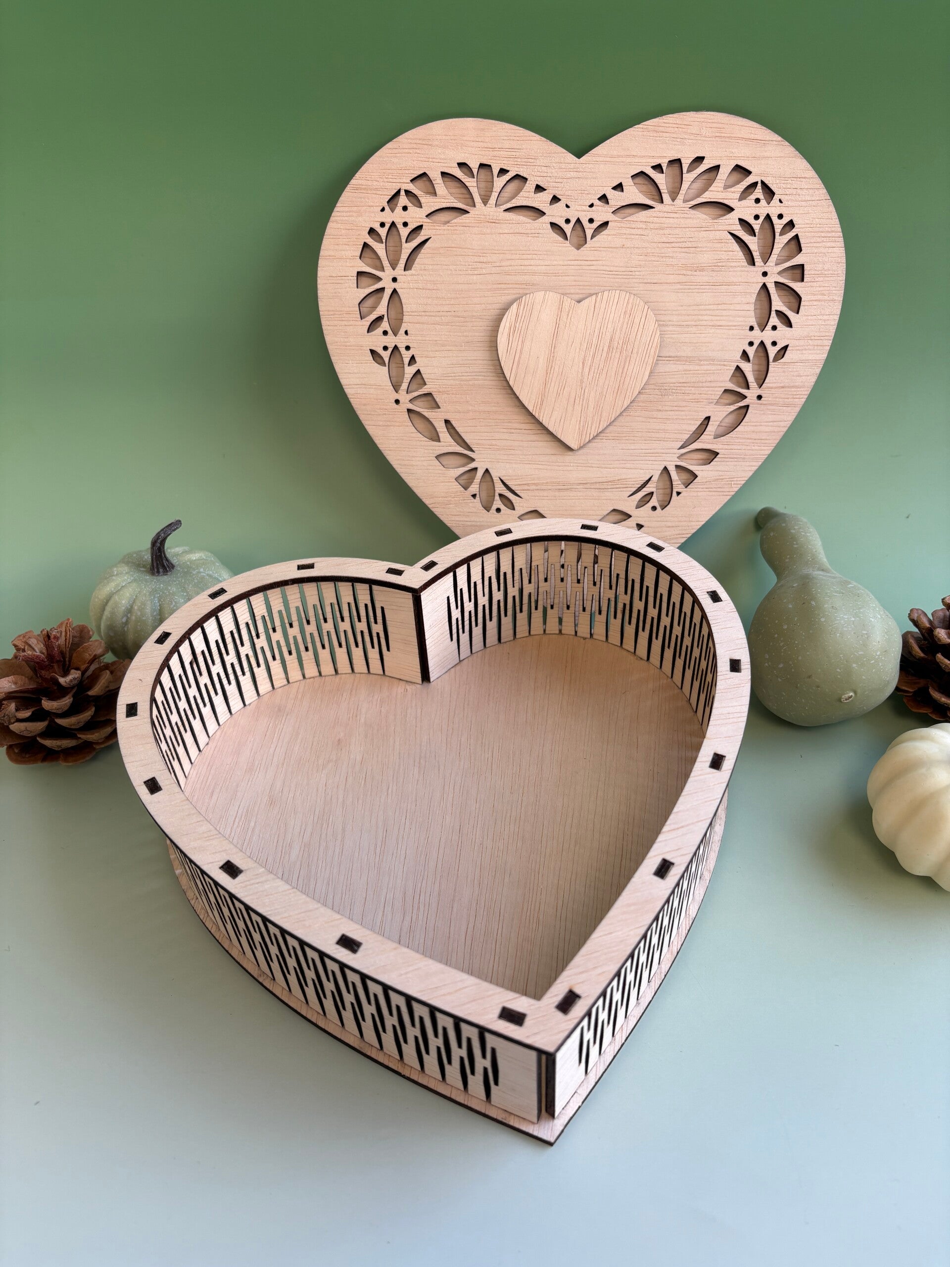 Decoratieve sierdoos in de vorm van een hart met prachtige opengewerkte details. De afmetingen zijn ongeveer 19cm breed (op de breedste punten) en 6cm hoog.