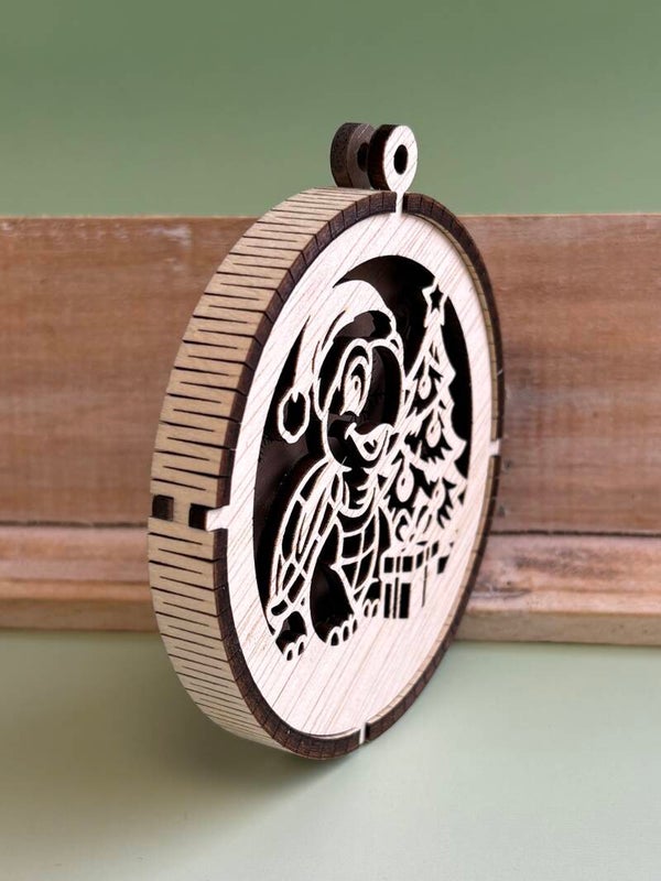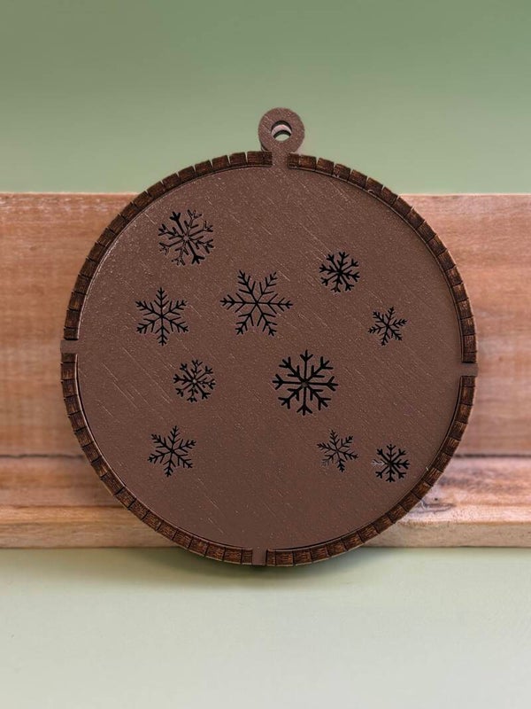 Houten lasergesneden kerstbal. Deze bal is gemaakt van 2 lagen 3mm dik multiplex, en heeft een prachtige opengewerkte rand wat een mooi 3D effect geeft. De bal heeft een doorsnede van 8,5cm en is onbehandeld gelaten voor een natuurlijke uitstraling. Als optie kan de achtergrond van deze bal in de kleur bruin geleverd worden.