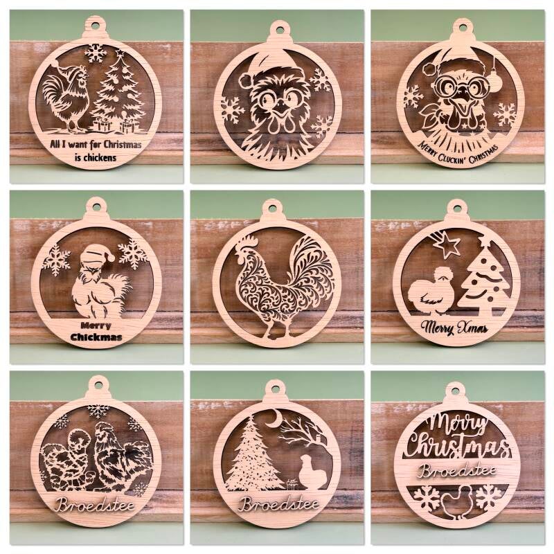 Hieronder vind je een overzicht van onze met zorg lasergesneden kerstballen en ornamenten. Elk item wordt vervaardigd uit 3 mm dik hout en met veel aandacht afgewerkt.